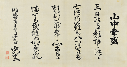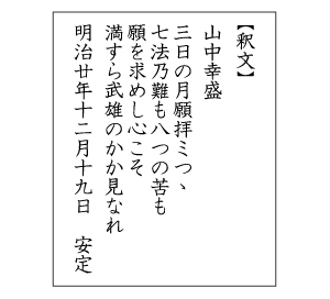 この作品は、籠手田が明治20年(1887)12月19日、山陰の戦国武将として有名な山中幸盛こと山中鹿之助の「七難八苦」の逸話を書いたものです。三日月に七法の難、八つの苦しみを願い、主君・尼子氏の再興を果たそうとする心こそ武勇(雄)の鑑(かがみ)であると称えています。明治20年は島根県知事時代であり、地元の英雄である山中鹿之助と自身の苦難を重ねて書いたものでしょう。