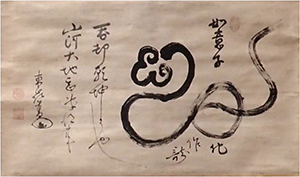 「如意画賛」 東嶺円慈(とうれいえんじ)筆 江戸時代に現在の東近江市に生まれ、近世臨済宗の名僧として知られる東嶺円慈(1721~1792)が僧の持ち物である「如意」の図を描き、余白にみずから賛(解説文)を書き添えたもの。 |