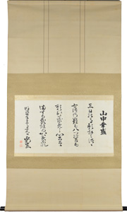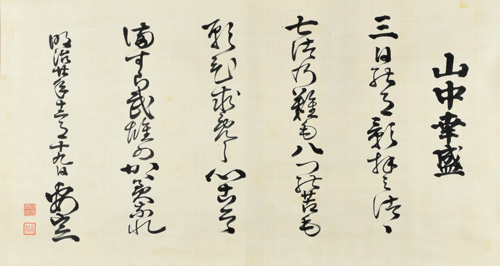 この作品は、籠手田が明治20年(1887)12月19日に書いたもので、山中幸盛(鹿之助)の「七難八苦」の逸話を書いたものです。三日月に七法の難、八つの苦しみを願い、主君の再興を果たそうとする心こそ武勇の鑑(かがみ)であると称(たた)えています。偶然にも、ドラマと同じく島根県知事時代に書かれたもので、地元の英雄である山中と自身の苦難を重ねて書いたものでしょう。