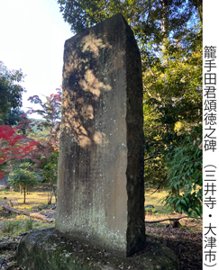 さて、三井寺には、前回ご紹介した第2代滋賀県令・籠手田安定の顕彰碑があります。金堂のすぐ近く、3メートル以上もある大きな石碑です。明治35年(1902)3月に建立され、上部には「籠手田君頌徳之碑」と題され、16行にわたり滋賀県令・知事としての徳政をたたえています。