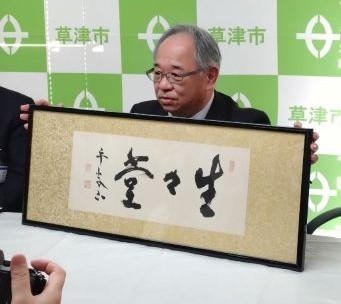 会見場で井上副館長が掲げているのは、寄贈者の書斎の号である「生々堂」の文字を、同じく草津市出身の画家・野添平米が墨で書いた額で、気持ちのこもった清々しい作品です。