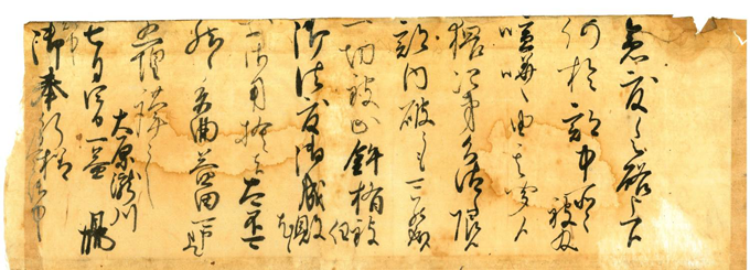 写真は、かつて当館の副館長が撮影した個人蔵の滝川一益書状写です。年不詳7月4日付けのもので、天正2年(1574)から10年までの発給と考えられます。内容は(甲賀)郡中奉行に宛て、郡中で起きた喧嘩を強く非難し、御法度に任せて成敗することがもっともだと勧告しています。差出が「大原滝川一益」と書かれていることが重要で、江戸時代前期の写ではありますが一益の花押をまねた「花押影」も据えられています。一益のルーツが近江甲賀であったことを証拠立てる、貴重な史料です。