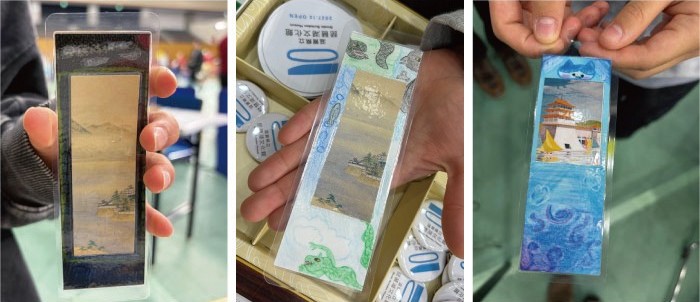 イベントでは、琵琶湖文化館や学芸員の仕事にふれてもらうため、私たちが得意とするオリジナルしおりづくりのワークショップを開催しました。博物館や学芸員というと、難しいイメージをもたれるかもしれませんが、しおりに使用する収蔵品の写真に皆さん興味津々!琵琶湖や近江八景といった、滋賀県ゆかりの作品を揃えたかいがありました(笑)。