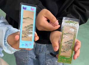 しおり作りには、参加者に掛軸(かけじく)の構造を理解してもらう目的があります。いつもは写真を選んでしおりを作るという体験ですが、今回は「お仕事体験」ということで、下地の色紙に絵や模様を描いてもらいました。これは、表装の形式の一種である、描表装(かきびょうそう)について知ってもらおうという試みでした。絵をかいてもらうのは難しいかな、と思いましたが、参加者の子どもたちは私たちの想像をはるかに超えた、ユニークで面白い作品ばかり!