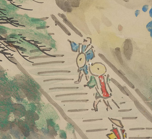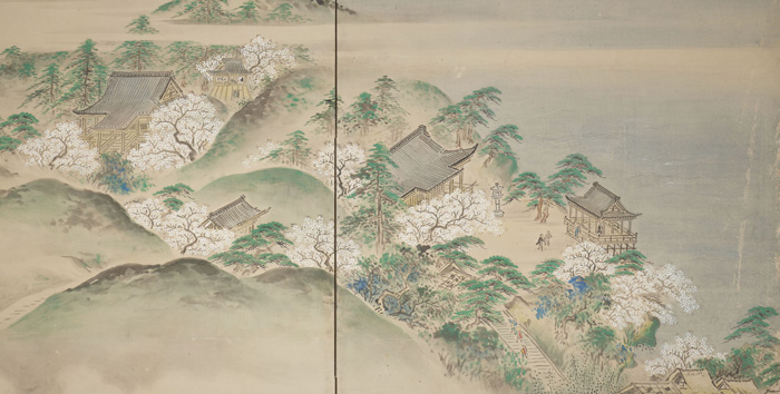 このうち左隻には、満開の桜に包まれた三井寺の伽藍が描かれています。花見に来た客なのか、はたまた参拝客なのか、旅人姿の人物が見えますね。