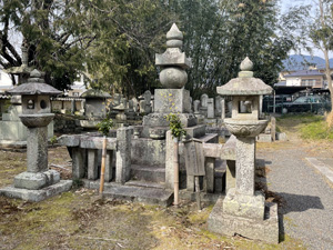 現在の墓石は寛文10年(1670)、可成の百回忌を機に子孫にあたる美作津山藩主・森長継らが建立したもので、瑞垣に囲まれた三段の基壇上に、大きな石造五輪塔がそびえ威容を誇っています。