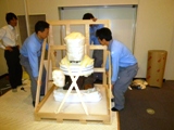 運んで来そうな雲がずずいっと流れて来てましたので、搬入は時間との勝負でした。そして今回もお手伝いいただきました心強い助っ人:文化財搬送のプロたち(何やらエジプトで「ツタンカーメン」