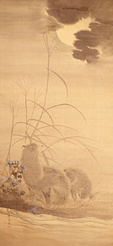 図版は、竹堂が得意とした動物画で、月光に照らされた秋の河原にひそむ2匹の狸を描いたものです。月にかかる雲は、濃淡の墨であらわし、ススキ、野菊を添えて秋の風情を見せています。月を見上げる狸の表情は穏やかなものとなっており、晩年の竹堂の心情を映しているようです。