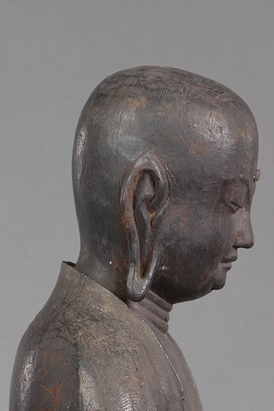 円頂相の比丘形で、額には白毫を表しています。右手を垂下して与願印とし、左手には、様々な願いを叶える宝珠を捧げ持っています。両足を揃えて蓮華座上に立っており、不動の安定感があります。目の詰まった針葉樹の一木から、右前膊・左前膊半ばまでを含んで彫出しており、内刳りは施していません。また、木心が像底では僅かに外れていますが、像の背面中央部では込められる木取りがなされているため、像の全面にわたって細かい干割れが走っています。 目鼻立ちが大きく、体躯に対して大振りな頭部の表現などから、一見、童子を思わせるかわいらしさを感じることができます。一方で、沈んだ目元の印象や、口元を引き締めた表情などには一種の沈鬱な陰があり、本像の魅力を深めていると言えるでしょう。 地蔵菩薩は、サンスクリット語で“クシティガルバ”といい、大地に満ちる様々な功徳を象徴した菩薩です。釈迦如来が入滅してより後、弥勒菩薩が成仏するまでの間、衆生の救済を司る存在とされました。特に六道救済の菩薩として信仰され、地獄からの救済を願う人々や、早世した子どもの救済を願って、多くの仏像が造立されました。 本像の腰の張りが強く、腹部や大腿部の肉付けを強調した表現は、唐招提寺・如来形立像(重要文化財)や、神護寺・薬師如来立像(国宝)などの系譜を引く、平安時代前期彫刻の影響を濃厚に見て取ることができます。また面長の頭部に、先端の尖った耳の表現などは、六道珍王寺・薬師如来坐像(重要文化財)とも共通性がうかがえます。 本像と同様に、二尺程度の小像で、悠然と構え、メリハリのはっきりした肉体表現を行う地蔵菩薩像は、法隆寺の地蔵菩薩立像(聖霊院安置・重要文化財)や、称名寺・地蔵菩薩立像(重要文化財)など、奈良地方に多く見られます。本像の近江仏像とは一種異なった印象も、これら南都仏像の影響を受けて造立されたことを想像させます。 東南寺は天台宗寺院で、創建年代は分かっていません。江戸時代(寛永年間)に桑実寺塔頭の正覚院が浄土宗に転宗し浄厳院(近江八幡市)末寺となった際、正覚院の末寺15か寺が東南寺につきました。この時、東南寺は正覚院寺格と寺務を引き継いだようです。 |