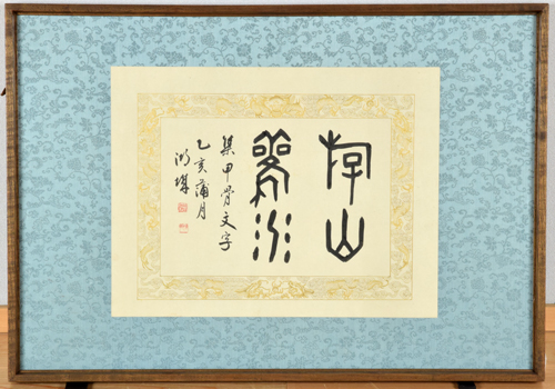 琵琶湖文化館には、大津市出身の篆刻家・園田湖城(1886~1968)が篆書で書いた作品が2種所蔵されています。①は額装、②は軸装で、いずれも、湖城が亡くなった翌年の昭和44年(1969)、①は竹内碧外(1896~1986)氏により、②は森岡峻山(1907~1991)氏によりそれぞれ寄贈されています。