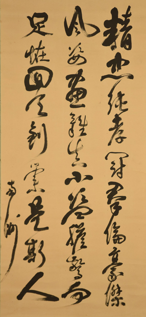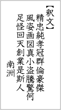 今回ご紹介するのは、堂々たる西郷隆盛の書作品で、28文字を3行に分けて書いています。内容は、尊王思想家として知られる高山彦九郎(1747~1793)の忠義心を称えた七言詩です。高山彦九郎は、吉田松陰や彼に学んだ志士たちに多大な影響を与え、西郷もその一人でした。 その内容は、「純粋なる忠義・忠誠心は、多くの人びとの中で突出したものであり、この絵(肖像)は真を捉えている。この絵を見た盗人も、驚くことだろう。世の中を変える契機を作ったのはこの人なのだ。」という意味で、詩の二句目に「豪傑の風姿、画図に真なり。」とあることから、高山彦九郎の肖像画を見た西郷が、高山の人となりについて作詩したものと考えられます。 その書風は、冒頭の文字を大きく書き、筆先を見せない蔵鋒の線、重厚でありつつも所々に渇筆(かすれた線)を用いてバランスを取る点など、西郷の書風の特徴が良く出ています。なお末尾の「南洲」とは、西郷の書家としての号です。 |