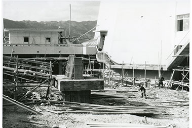 昭和35年9月土台の基礎工事を終えて、いよいよ建物部分の建設が始まります。湖岸に鉄骨を吊り上げる大きなクレーンが登場しました。